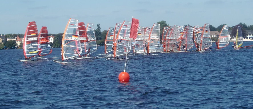 Bei strahlendem Sonnenschein und und 2-4 Windstärken starteten 34 junge Surfer aus Berlin, Werder, Kiel und vom Chiemsee zu 4 Tageswettfahrten.
