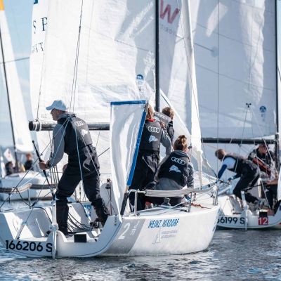 Trotz sehr leichtem, ablandigem Wind lagen wir nach dem ersten Segel Tag auf Platz 7. Wegen der schwierigen Bedingung waren die Punktabstände nach vorn sehr gering, welches gute Aussichten für den zweiten Regattatag bot.