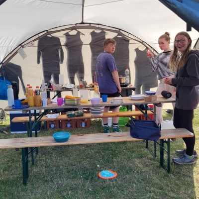 Stunden in Kiel an, dort sicherten wir uns als erstes einen Platz auf dem Campingplatz. Anschließend luden wir die Boote ab und bauten unser gemeinsames Zeltlager auf, darunter ein Pavillon der uns als Treffpunkt diente und der außerdem zum Kochen und zum Frühstücken nützlich war. Als wir mit