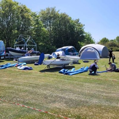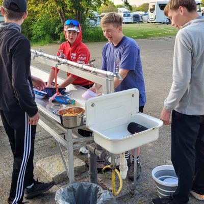 allem fertig waren, gingen einige Leute einkaufen um uns für die nächsten Tage zu versorgen und die anderen bestellten Pizza zum Abendessen. Danach gingen wir in unsere erste Nacht im Zelt. Am nächsten Tag (Freitag) haben wir eine längere Trainingseinheit gemacht und haben uns bei gutem Wind und Welle eingesegelt. Wieder an Land haben wir uns für die Regatta gemeldet und andere Organisationen vollbracht. Am Abend haben wir dann mithilfe einer Induktionsplatte Nudeln gekocht.